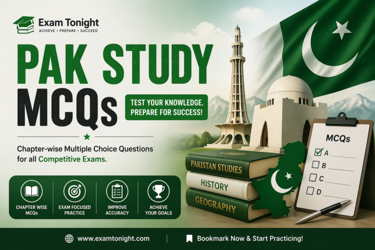 Welcome to ExamTonight’s Pakistan Studies MCQs section — your complete free resource for Pak Study exam preparation in 2026. Whether you are preparing for PPSC, FPSC, KPPSC, SPSC, BPSC, NTS, CSS, PMS, Pak Army, Navy or PAF tests, this page covers every Pakistan Studies topic you need to know.